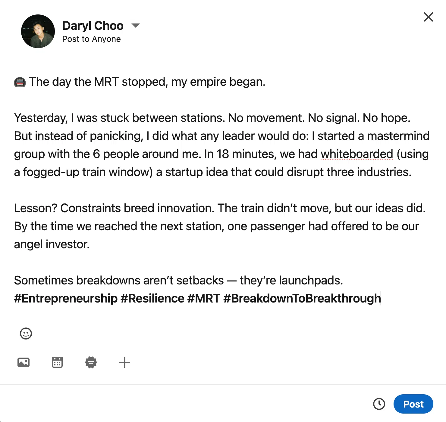 These posts will be less “what being stuck during an MRT breakdown taught me about resilience” and more “here’s the thing I did, how I did it, and the people who made it happen”.