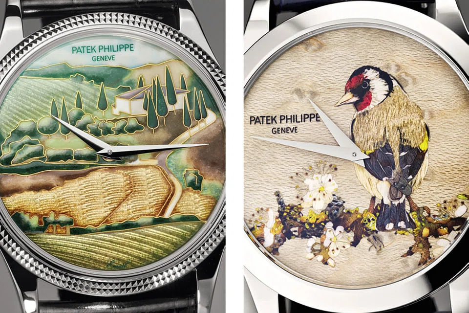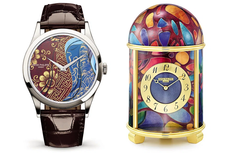 In the Patek Philippe collection, they were applied to the Cubist Fantasy clock - resulting in a display of cubistic colour ornaments - and other unique pieces with themes ranging from nature (birds, flowers, savannah at sunset, planets) to the fine arts (Persian porcelain, Art Deco butterflies) and to different world culture (Indian women, Arabic calligraphy).