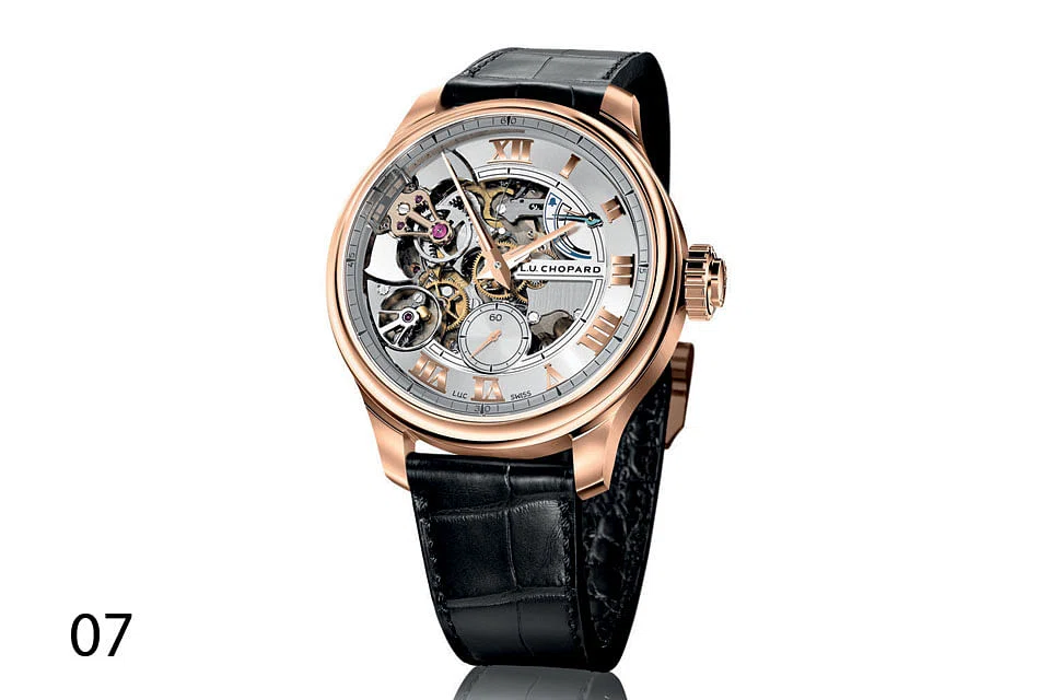 07 The sound produced when Chopard's LUC Full Strike (S$351,330) strikes the hours, quarters and minutes is literally crystal clear. Indeed, the judges at the 2017 Grand Prix d' Horlogerie de Geneve were so enthralled that they presented the chiming timepiece in a rose-gold case the luxury watch industry's equivalent of Hollywood's Academy Award. Chopard has succeeded - where many failed - in installing a steel hammer striking sapphire crystal instead of the usual steel or gold gongs to produce a minute repeater that tells the time loud and clear. What's more, the watch, which is Chopard's first full acoustic timepiece and most complicated creation, is equipped with other world-first features, including three security devices protecting the minute repeater from damage by mishandling.