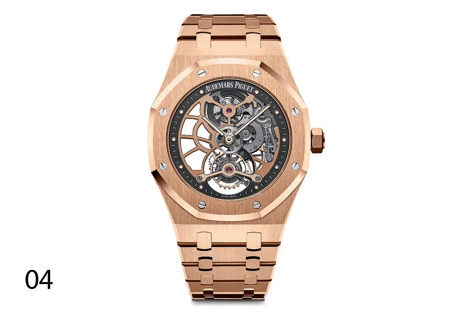 04 A work of high complication, Audemars Piguet's Royal Oak Tourbillon Extra-Thin Openworked boasts a gravity-defying mechanism which minimises the impact of the force from the earth's centre on the watch's accuracy. And you can admire the working of this tourbillon device through a delicately handcrafted skeletal dial, which is a work of art in itself, encased in solid pink-gold with a matching integrated pink-gold bracelet. The brand famous for launching the first luxury sports watch in 1972 when it rolled out the first Royal Oak model, identified by the exposed screw heads on the bezel and unique case design, has unveiled a platinum version of the Royal Oak Tourbillion Extra-Thin Openworked in 2011 to mark the Royal Oak's 40th anniversary. A yellow-gold version appeared last year. The latest Royal Oak Tourbillon Extra-Thin Openworked In pink-gold case is priced at around S$299,200 - the high price no doubt also reflects that only 50 watches of this model are made.