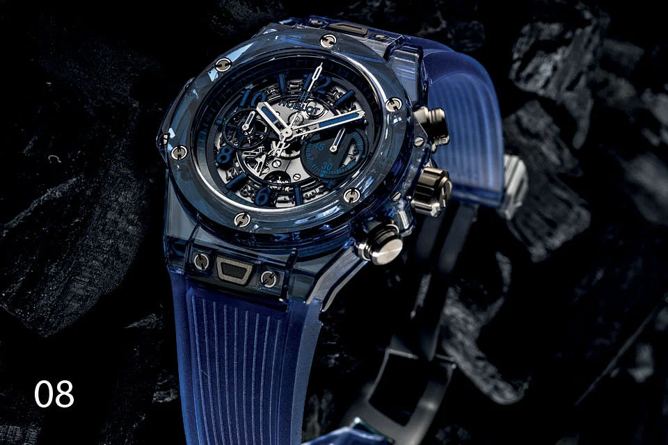 08 Hublot cut a sapphire case of an unprecedented scale two years ago, mastering a complex material which is both ultra-resistant and totally "invisible" thanks to its transparency. It has now turned the case to blue with the new Big Bang Unico Blue Sapphire (S$120,400) in a limited edition of 250 pieces. There're coloured synthetic sapphires in the market, but none exceeding 2kg. It's very difficult to produce bigger ones - and in perfectly uniformed colour. Pushing the limits of engineering and chemistry, Hublot has developed a sophisticated and costly process to lick the problem. The result is the Blue Sapphire which retains all the desirable properties of the material.