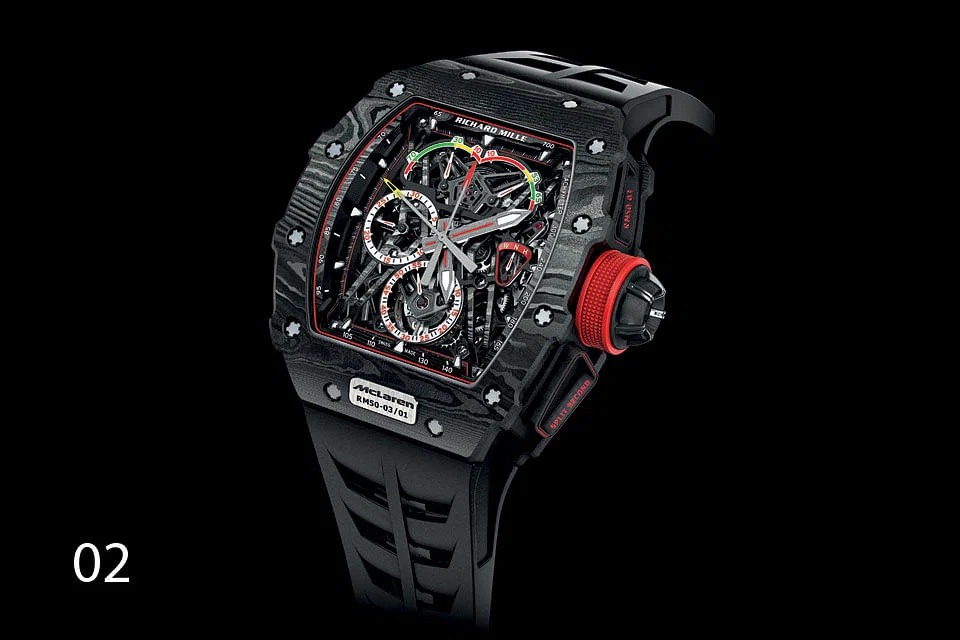 02 Richard Mille timepieces are hot in Asia, where a RM watch on your wrist marks you out for envy. They are even a status symbol in Singapore, commanding prices from S$115,000 to north of S$3 million. The RM 50-03 McLaren F1 (S$1.37 million), a split second tourbillon chronograph, sells for over S$1 million - if you can get your hand on one. It's a limited edition of 75 pieces. The watch is marketed as the product of a tie-up with McLaren, which the brand's car-mad founder Richard Mille says is "one of the biggest names in automotive and F1 history". The collaboration provided Richard Mille access to cutting-edge technical materials. So the RM 50-03 incorporates not just titanium and carbon TPT, originally developed for the sails of racing yachts, it also introduced a new carbon material - Graph TPT - into the world of watch making.