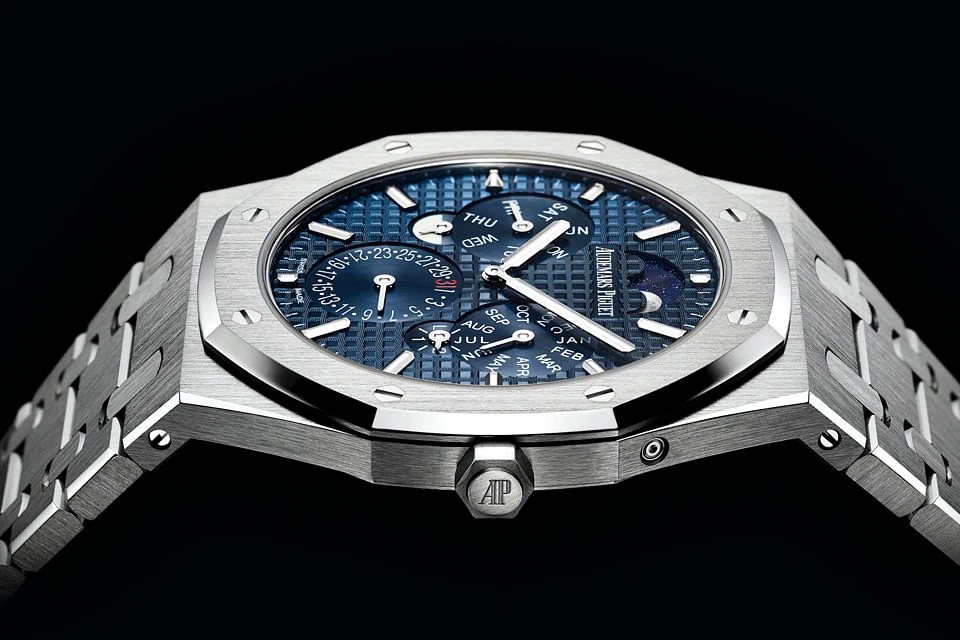 RD#2 features a "Grande Tapisserie" blue dial that shows improved readability (over the existing perpetual calendar model) and expanded counters, including a night and day indication. The moonphase at 12 o'clock pays homage to Audemars Piguet's first perpetual calendar watch launched in 1955. W