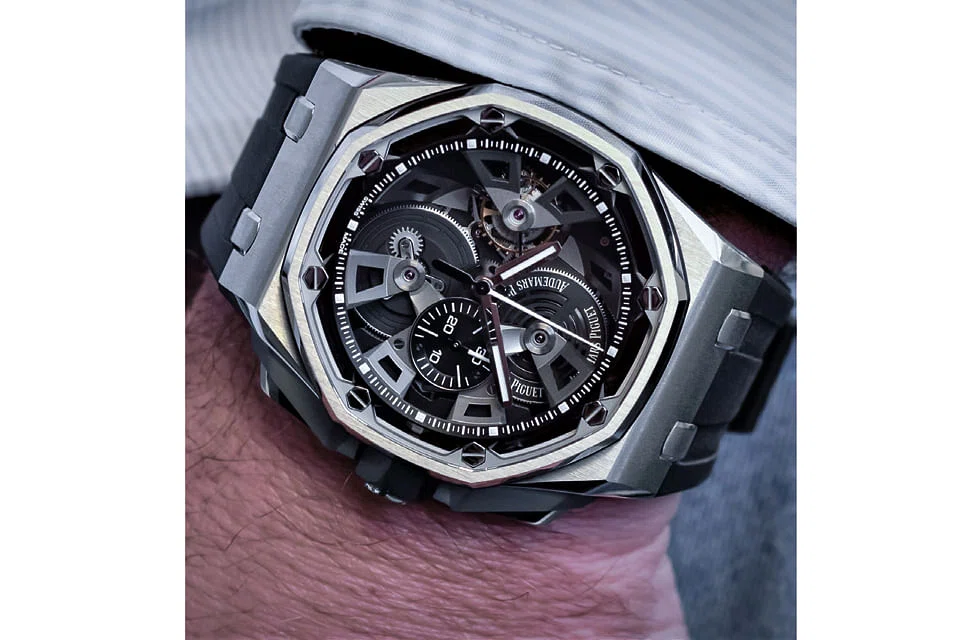 "With a new architectural construction featuring sandblasted titanium bridges and satin-brushed chamfered edges, the movement looks as if it were suspended from the bezel," Audemars Piguet says.