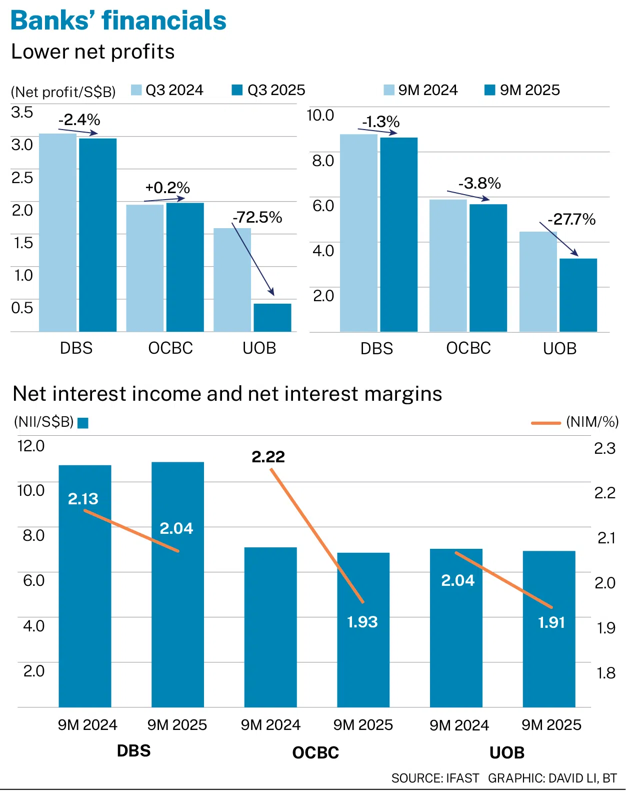 The rally has been underpinned by steady third-quarter earnings. DBS reported a modest 2.4 per cent year-on-year decline in net profit, while OCBC posted a marginal 0.2 per cent increase.
