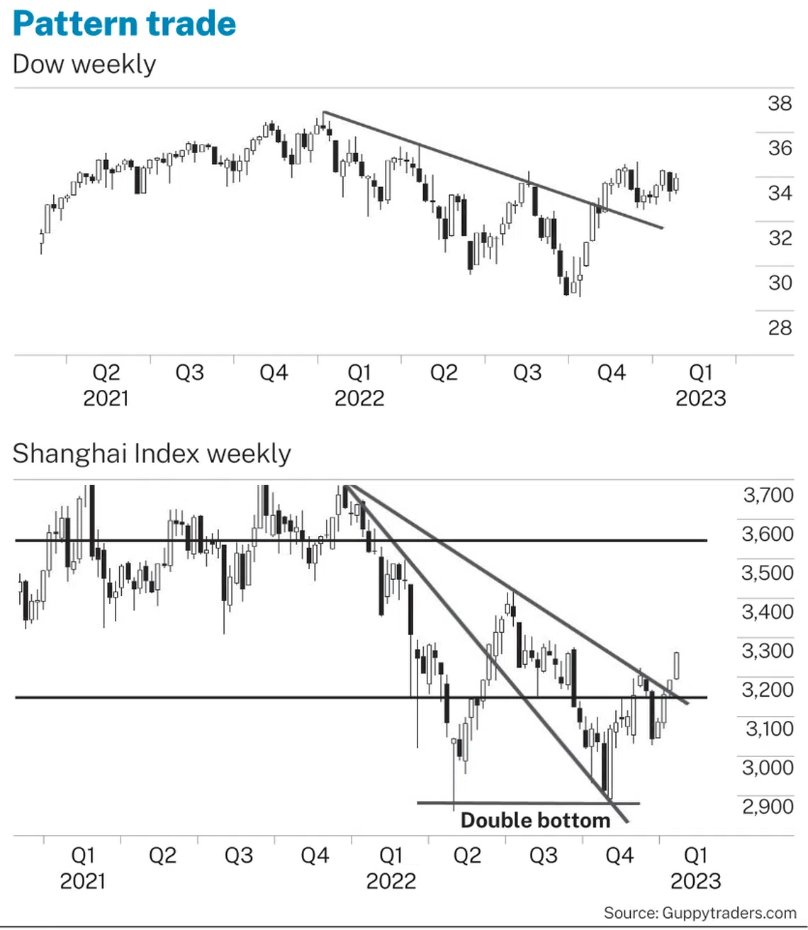 The Shanghai Index has three defining features. The first is the double bottom that developed near 2880. This pattern is often associated with a strong trend reversal.