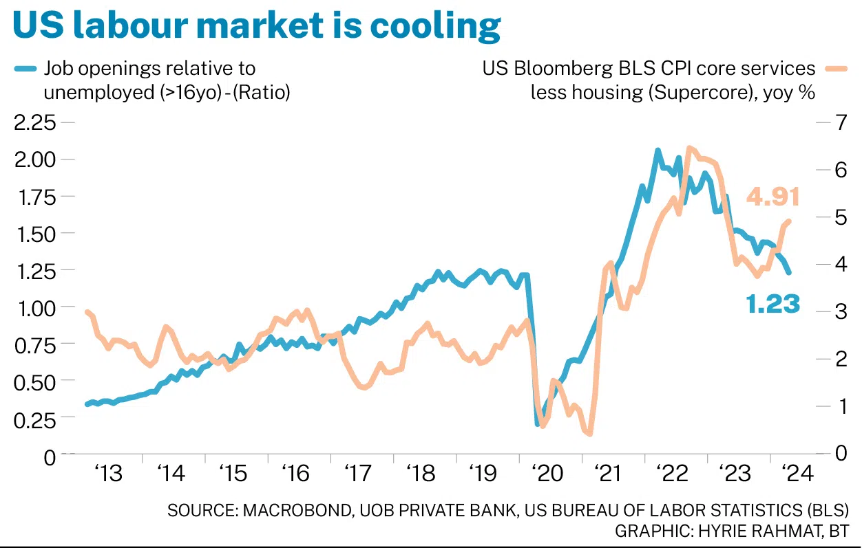 While inflation is persisting for a longer-than-expected period, it is projected to decline. This is due to the Owner Equivalent Rent component in the Consumer Price Index (CPI) lagging the decline seen in new rents which will converge. Another area of concern is services inflation. Inflation from core services excluding housing, or the Supercore CPI, had a quarterly growth of 1.98 per cent from 0.99 per cent in the fourth quarter of 2023. However, with the labour market cooling as the current job-workers gap returns to the pre-pandemic level, services inflation is likely to fall.