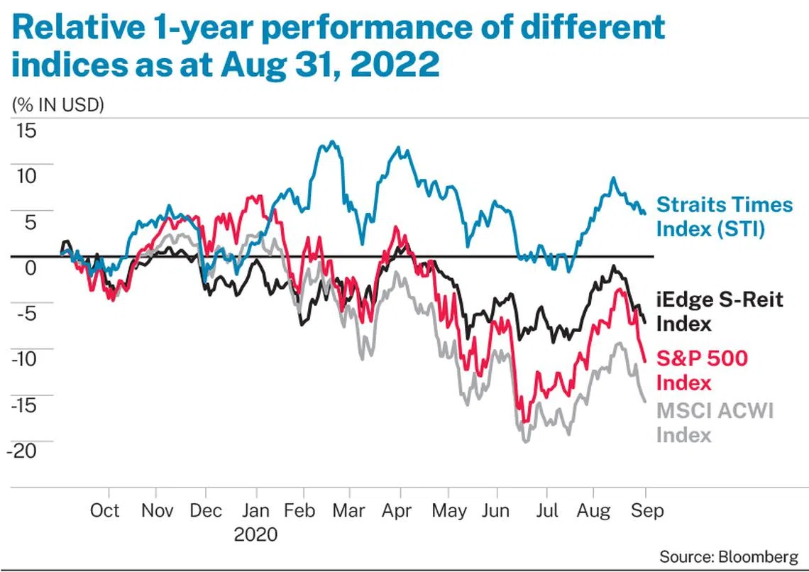 As at Aug 31, 2022, the MSCI all-country world index has generated -15.8 per cent in total returns year-on-year, while the S&P 500 has returned -11.3 per cent. Over the same period, the Straits Times Index has returned 8.6 per cent, while the iEdge S-Reit index has returned -3.6 per cent in total returns.
