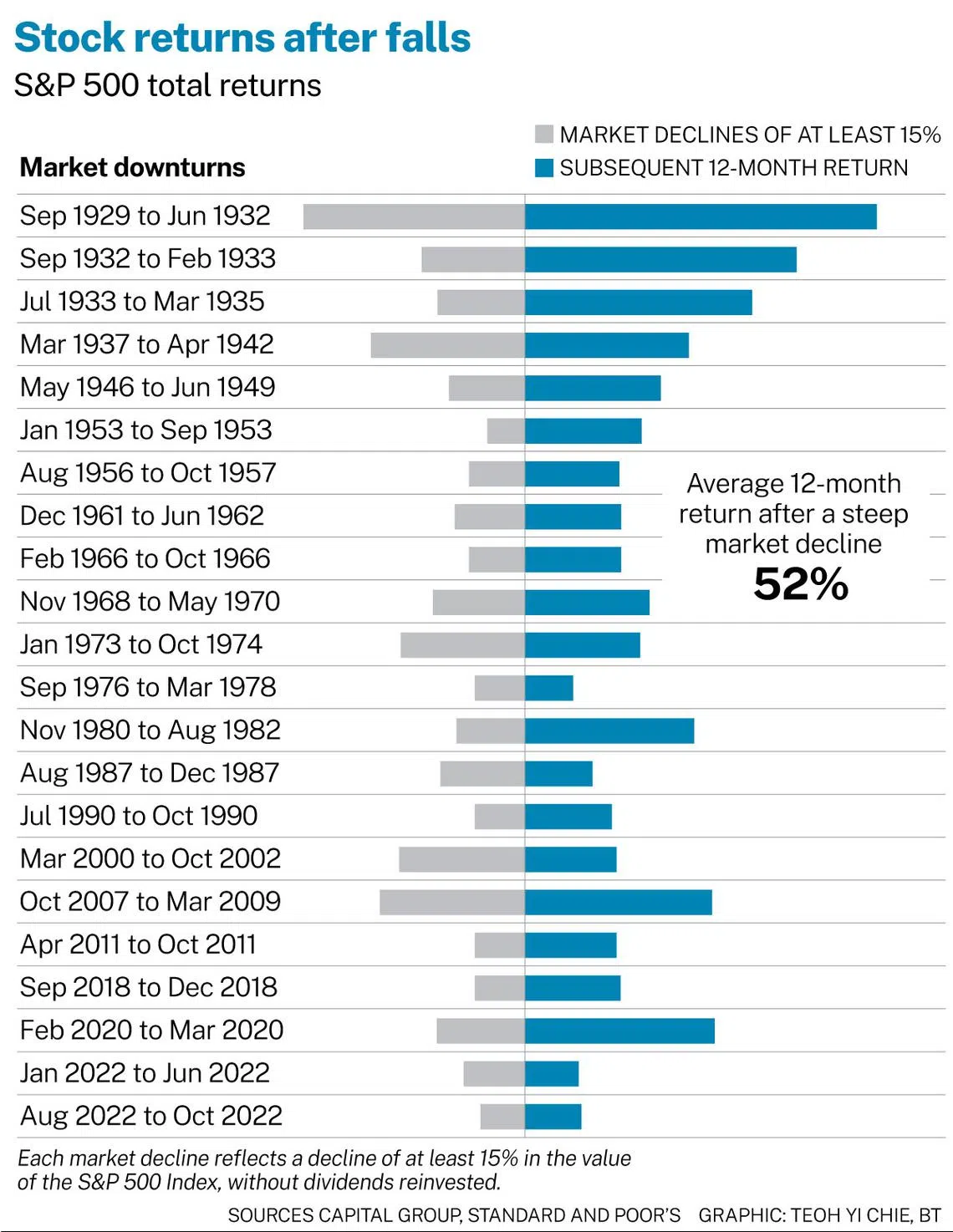 While markets can be treacherous during periods of heightened volatility, they have often bounced back quickly. Indeed, stock market returns have typically been strongest after sharp declines. The average 12-month return from the S&P 500 immediately following a 15 per cent or greater decline is 52 per cent. That is why it is often best to remain calm and stay invested.