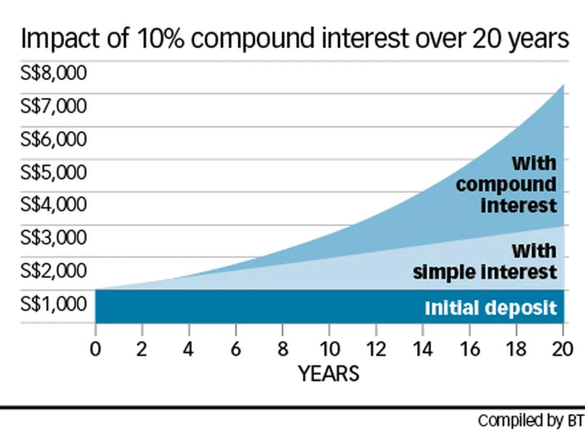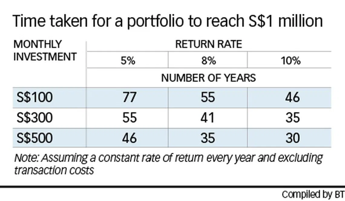 If you start with S$300, and you invest S$300 monthly for 40 years, assuming a rate of return of 8 per cent every year and not taking into account transaction costs, you will end up with just under S$1 million - with a total investment of S$144,000.