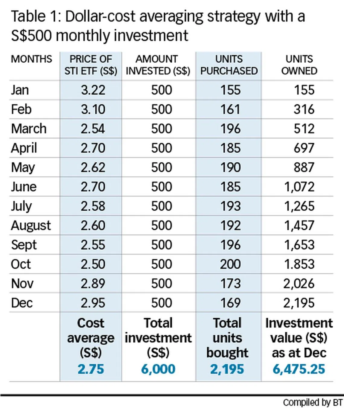 For example, instead of buying S$6,000 worth of shares or fund units at one go, you buy S$500 worth of shares or units every month over a period of 12 months - ideal for those who do not have a huge capital set aside for investments from the get-go.