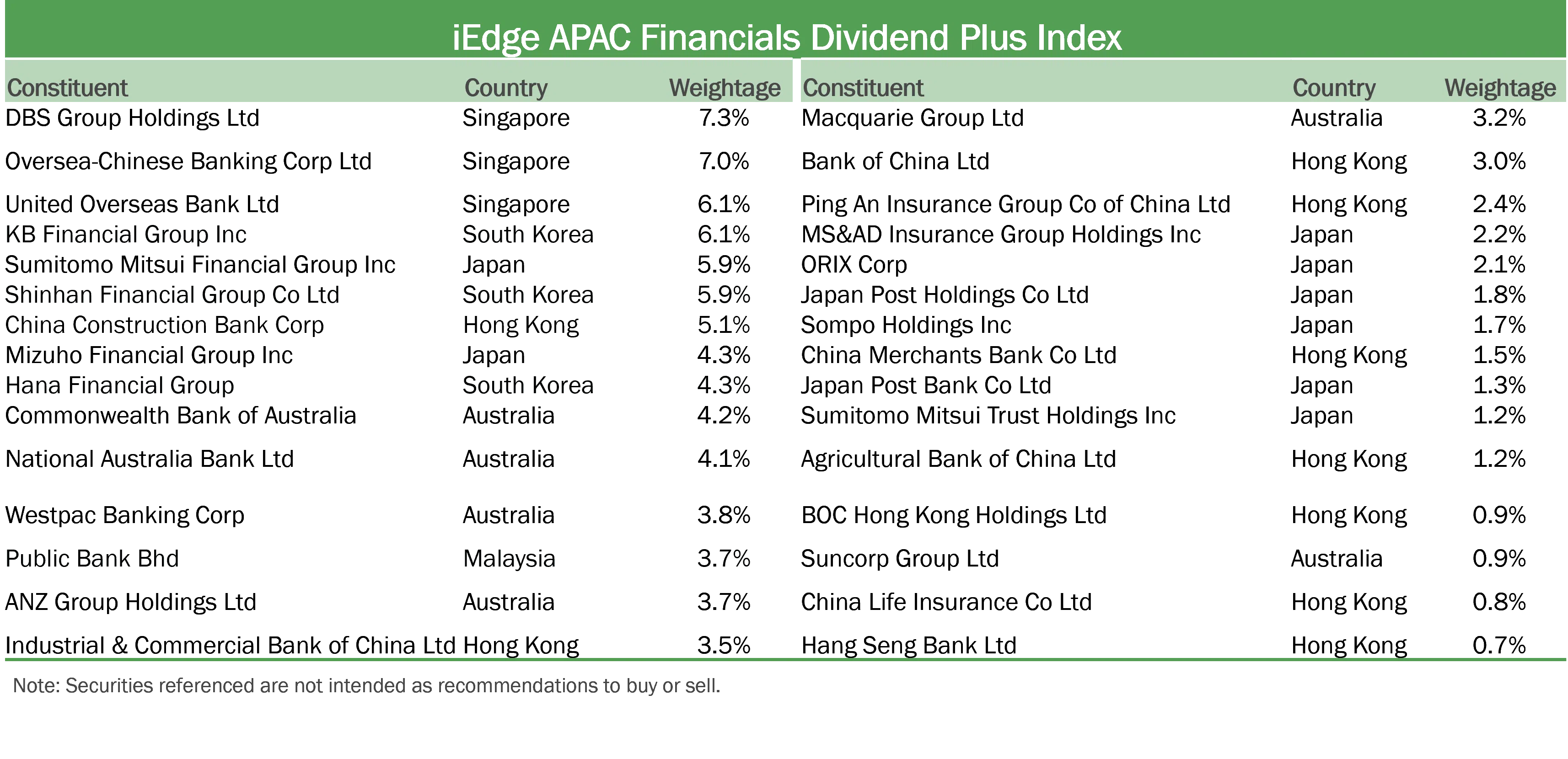 The Lion-OCBC Securities APAC Financials Dividend Plus ETF provides investors with exposure to the 30 largest and most tradable companies listed in the region