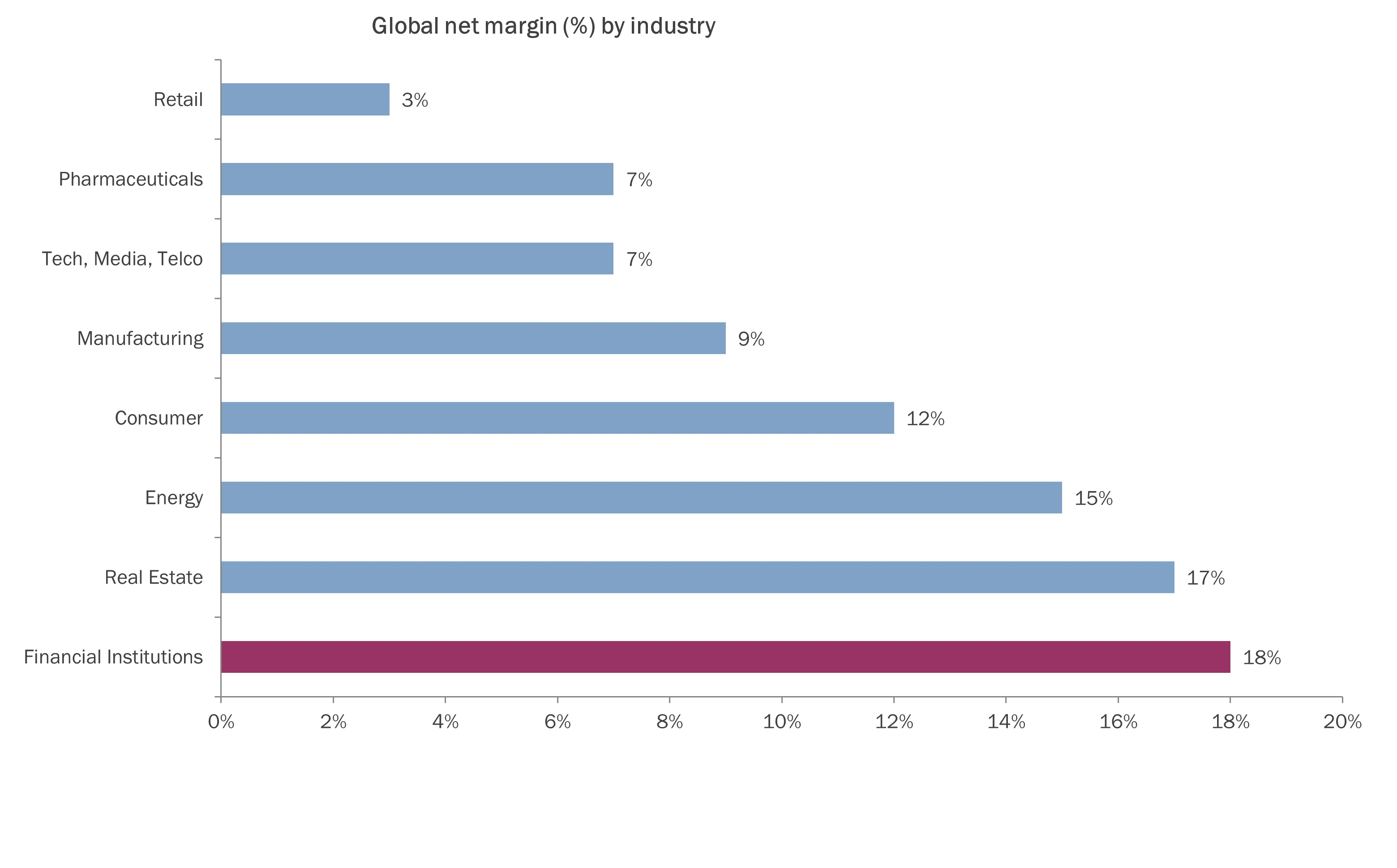 A 2023 report from Boston Consulting Group found that global financial institutions average a net profit margin of 18 per cent, compared to just 7 per cent for the tech, media, and telecommunications sector. Financial institutions are adept at leveraging technology to streamline operations and boost margins through digitalisation.
