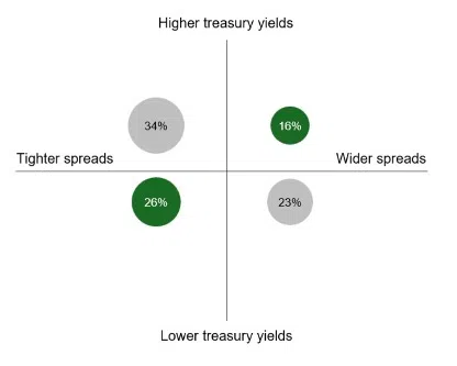 The relationship between treasury yields and credit spreads, and their frequency of occurrence