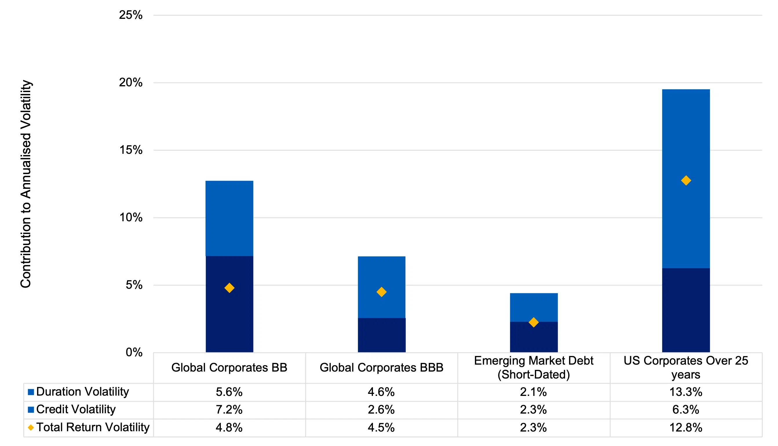 Owning bonds with longer duration can be valuable over time but is also a considerable risk for fixed income portfolios. We have analysed the drivers of return volatility across different credit sectors and found that duration is a key driver of return volatility for many credit assets over the past 10 years. For example, bonds with a maturity of more than 25 years face double the return volatility risk from duration than credit risk. In contrast, more credit-sensitive areas such as high yield BB-rated bonds are less affected by duration.