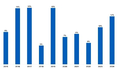 The following chart shows the return differential between the top performing market and the worst performing fixed income market on a calendar year basis, using the same data as the return matrix above. The lowest differential in the past 10 years was 5 per cent in 2018, and the highest was 15 per cent in 2016, 2017 and 2019, three years in a low-interest rate environment, with an average of 10 per cent.