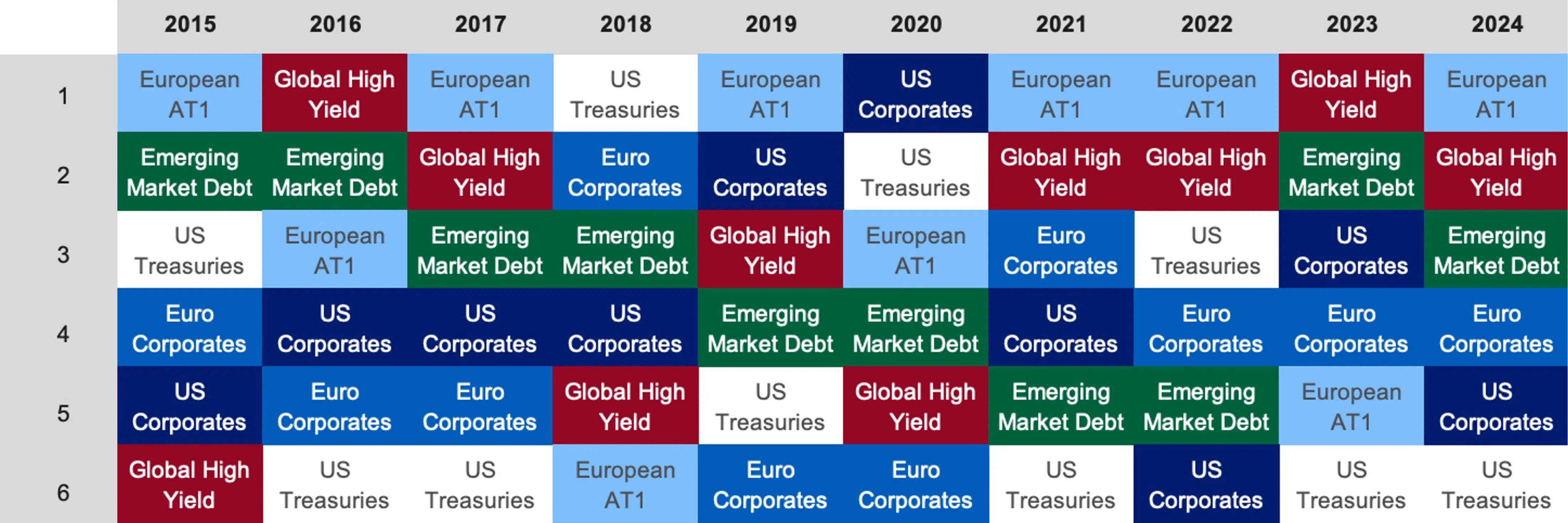 A ranking of the top six key fixed income markets according to annual returns between 2015 and 2024