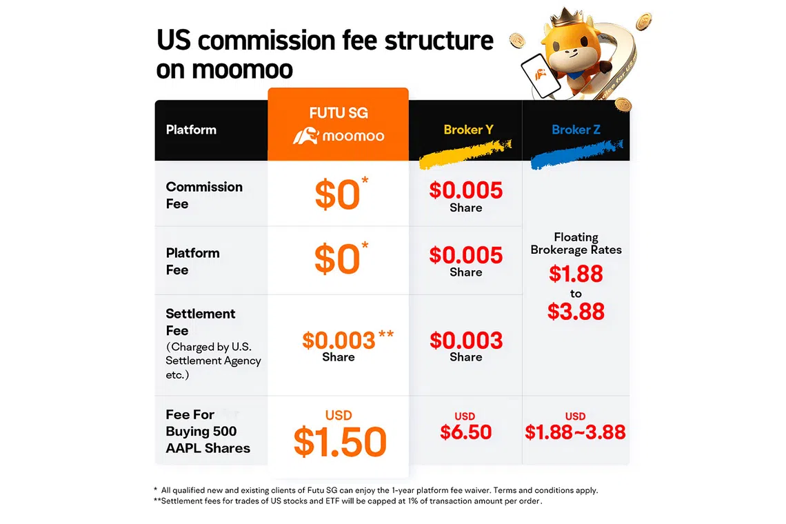 Futu SG (moomoo) also charges $0 platform fees* and $0 market data fees*, making the cost of trading even more affordable for retail investors.