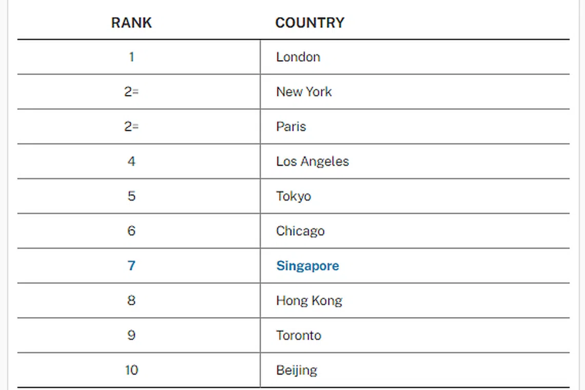 In the firm's City Wealth Index, which reflects the world's wealth capitals, Singapore rose to 7th place, overtaking Hong Kong. The top 5 in the index are London, New York, Paris, Los Angeles and Tokyo. Hong Kong ranked 8th.