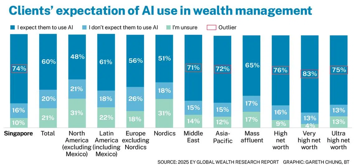 [SINGAPORE] Private wealth clients in Singapore expect their wealth managers or advisers to incorporate artificial intelligence (AI) into their offerings, more than clients globally or in the Asia-Pacific (Apac), the 2025 EY Global Wealth Research Report has found.