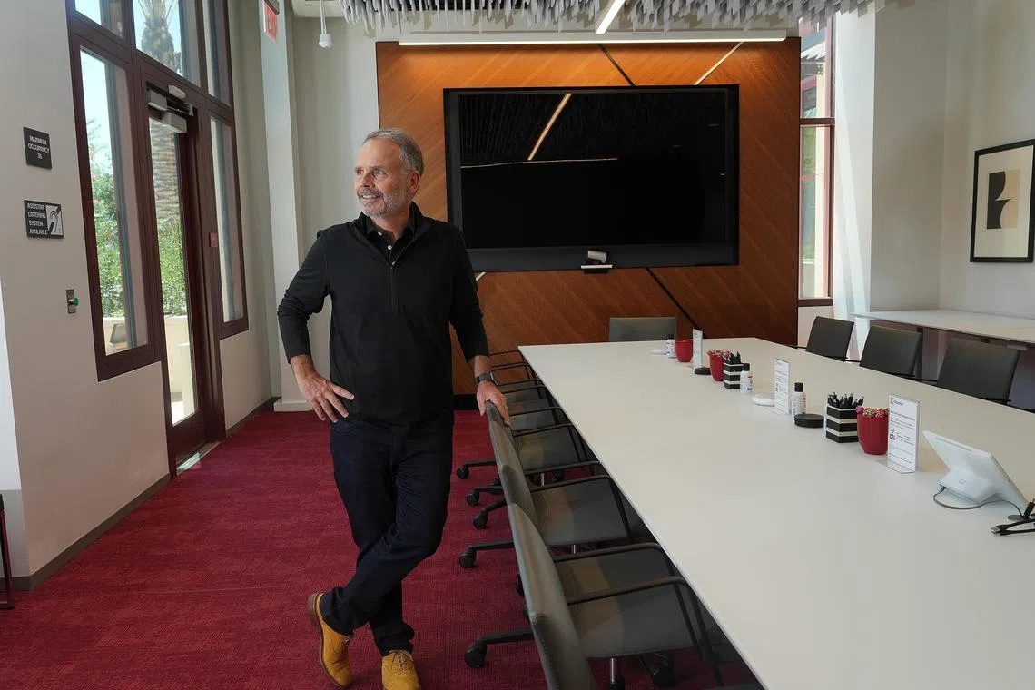 VISITORS to the Springline complex in Menlo Park, California, are surrounded by a sense of comfort and luxury often found at high-end hotels: off-white walls with a Roman clay finish, a grey-and-white marble coffee table and a white leather bench beneath an 8-by-4 resin canvas etched with the words “Hello, tomorrow”.