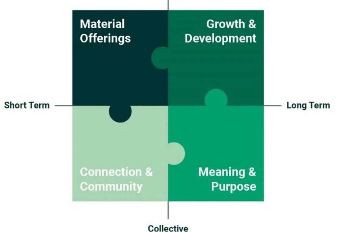 In response to this, we devised the integrated employee value proposition (iEVP) as a way for companies to adopt a more balanced approach to the process. The holistic system comprises four interrelated factors: material offerings, growth and development, connection and community, and meaning and purpose.