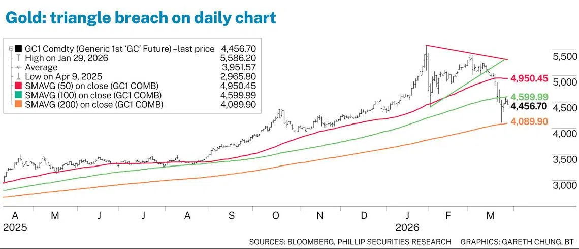 纽约商品交易所(COMEX)黄金期货已跌破4400美元关口,并在接近4130美元的200日移动平均线(DMA)处找到支撑,这巩固了该水平作为一个关键的长期技术位。随后,受美国暗示可能进行“和平谈判”的推动,金价大幅反弹,逼近4633美元的100日移动平均线,并于3月25日测试了这一水平。
