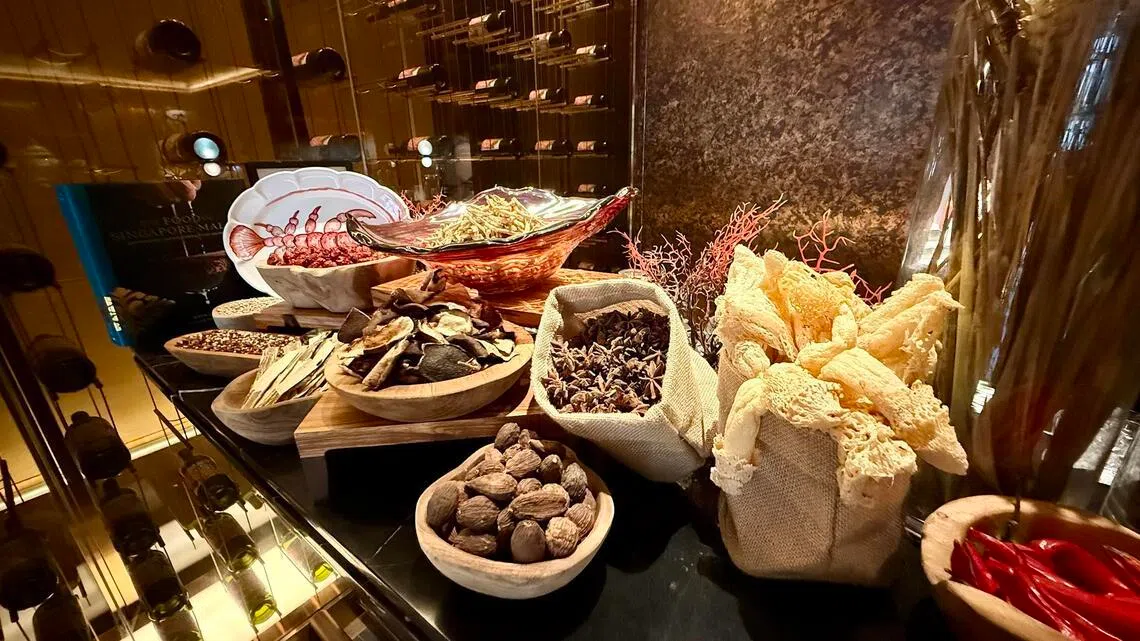 一幅喧闹的中式壁画——描绘着锦鲤、明代瓷器和其他一些文化符号的陈词滥调——占据了整面墙,营造出一种全包式旅行团的氛围。不妨忽略它,将注意力集中在陈列台,那里摆满了堪比中药铺的各种草药、香料和补品——为你即将享用的晚餐提供了一个诱人的预告。