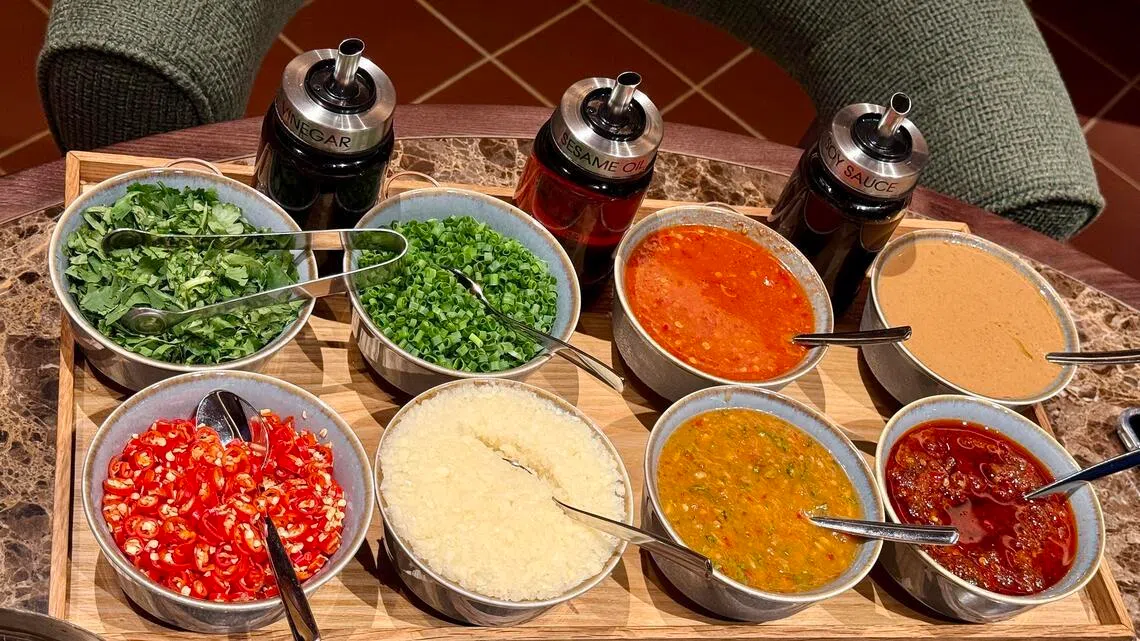 别忘了酱料,这里有强大的佐料阵容,包括生蒜末、叁巴峇拉煎、泰式辣椒酱和豆瓣酱。你可以自己混合搭配,也可以让热情好客的服务员 Eebil 和 Mason 为你代劳。