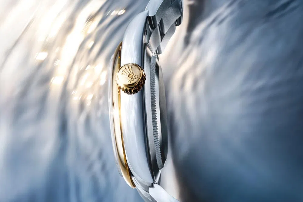 Oyster Perpetual 41的表冠上刻有数字100。 图片来源:ROLEX